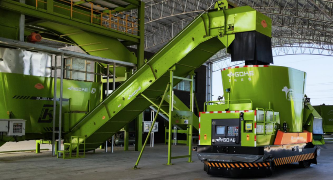 The feeding robot is equipped with a stirrer and blades, which can cut and stir the feed by itself.